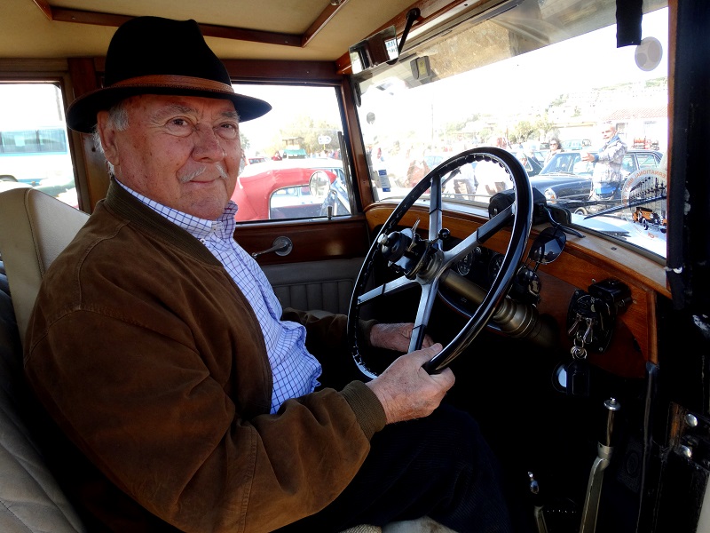 Ο κύριος Νίκος με το σπορ καπελάκι του στο τιμόνι της παλιάς Ρολς Ρόϋς του. Σαν σκηνή από ταινία εποχ'ης (φωτ. Εν Άνδρω).