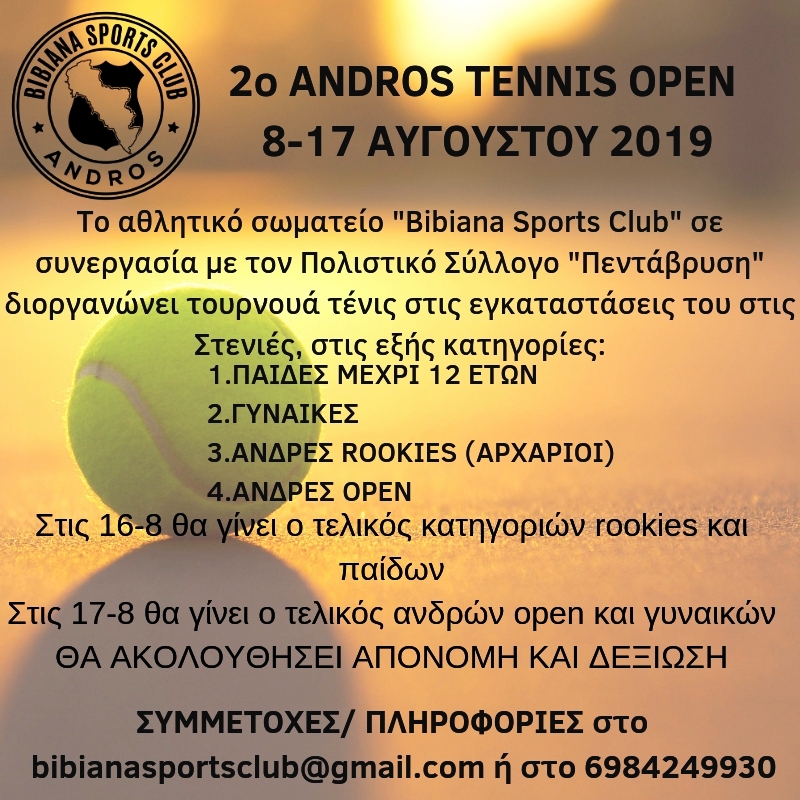 Για τέταρτη φορά (δύο πασχαλινά και δύο καλοκαιρινά) και για δεύτερο συνεχόμενο Αύγουστο το αθλητικό σωματείο "Βibiana Sport Club” σε συνεργασία με τον Πολιτιστικό Σύλλογο "Πεντάβρυση" διοργανώνει το 2o ANDROS ΤΕΝΝΙΣ OPEN μεταξύ 8-17 ΑΥΓΟΥΣΤΟΥ 2019 στις εγκαταστάσεις του στις Στενιές.