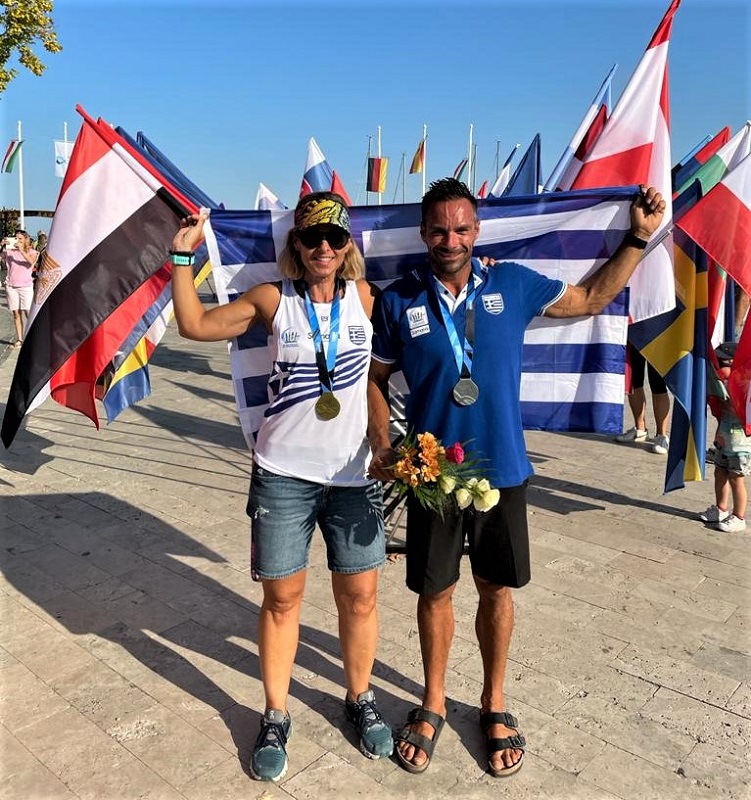 Ο Γιώργος Φράγκος (ασημένιος στο ομαδικό) και Πένυ Τσαούτου (χρυσή στο Mastetr) με τα μετάλλια τους στην Ουγγαρία. Και οι δύο κρατούν την ελληνική σημαία που τίμησαν.