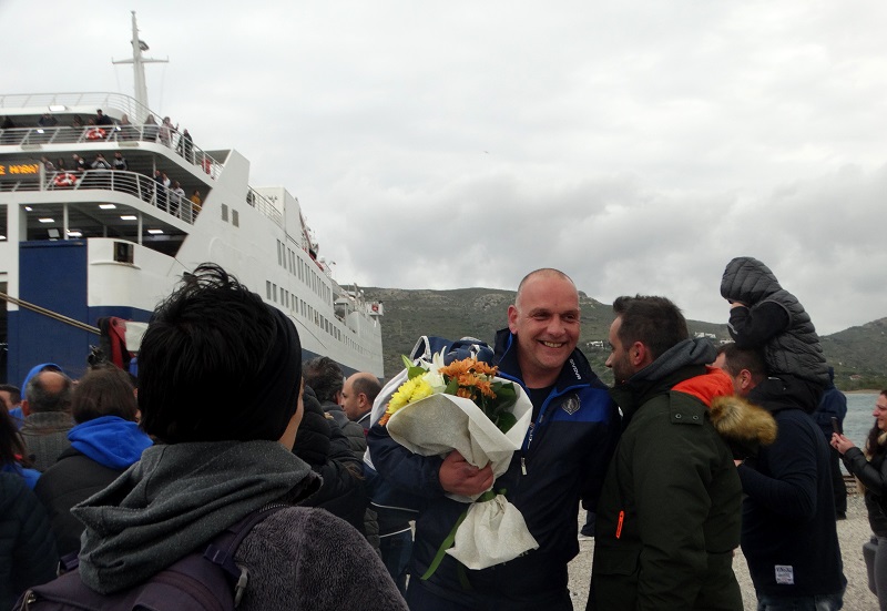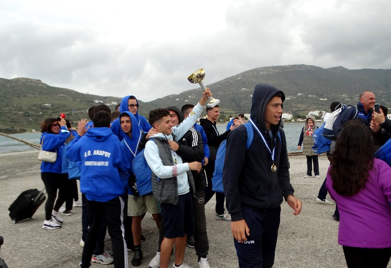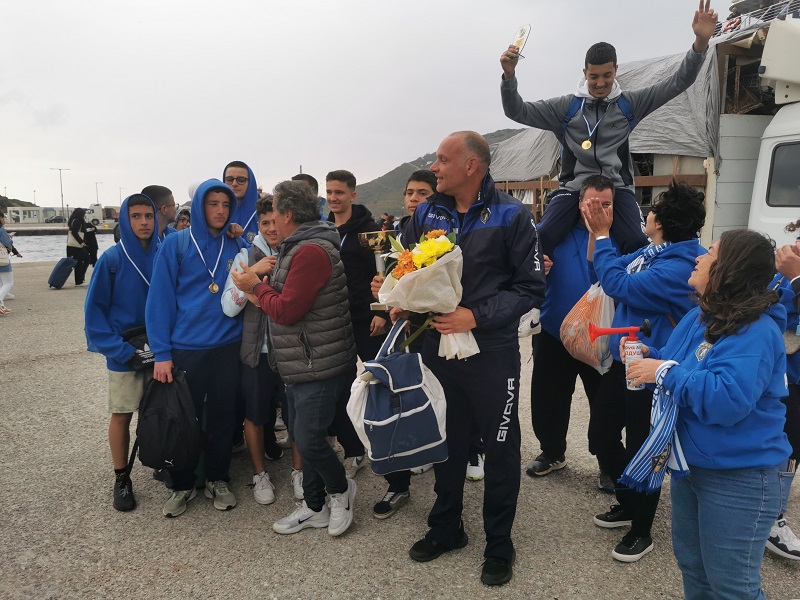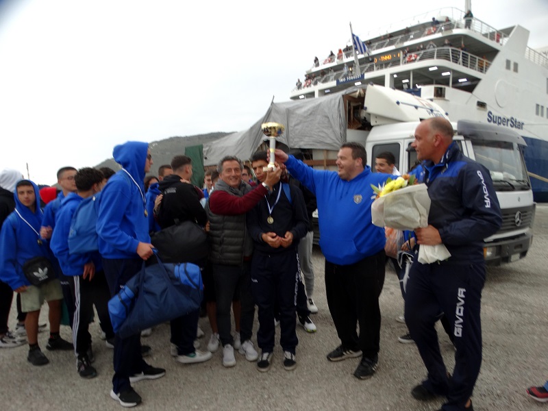 Με την χαρά της αθλητικής επιτυχίας οι μικροί πρωταθλητές κατέβηκαν σχεδόν τρέχοντας από το πλοίο και έπεσαν στις αγκαλιές των φίλων και οικείων που τους περίμεναν κορνάροντας και ανάβοντας φωτοβολίδες...