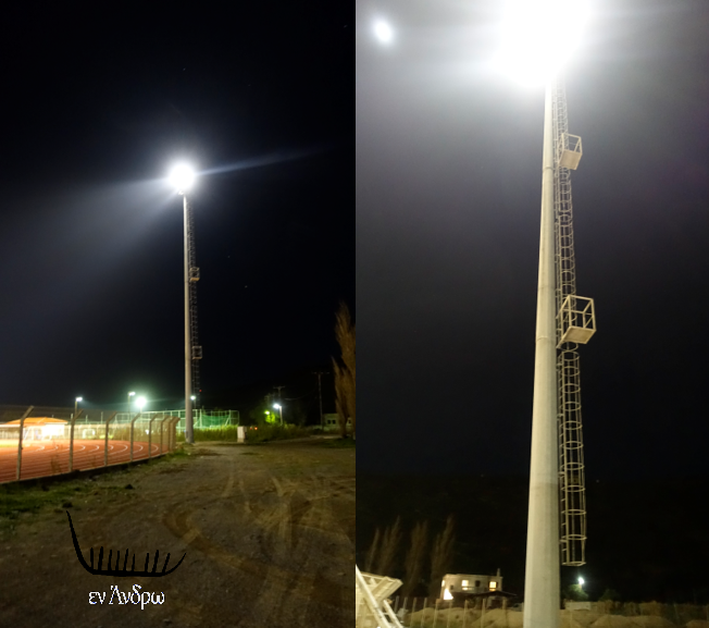 Δύο από του τέσσερις ολοκαίνουριους πυλώνες του εντελώς ανανεωμένου σταδίου. Τα φώτα είναι LED μειωμένου ενεργειακού κόστους. Ο νυχτερινός φωτισμός ασφαλείας είναι για να μπορούν αθλητές και άλλοι να βλέπουν σε περίπτωση που πάνε βραδυνές ώρες για τζόκινγκ κλπ. Στη φωτογραφία δεν είναι ο πλήρης φωτισμός του σταδίου. Αλλά ο φωτισμός ασφαλείας λόγω οικονομίας. Από τα 8 φώτα κάθε πυλώνα εδώ είναι αναμμένα μόνο τα δύο.