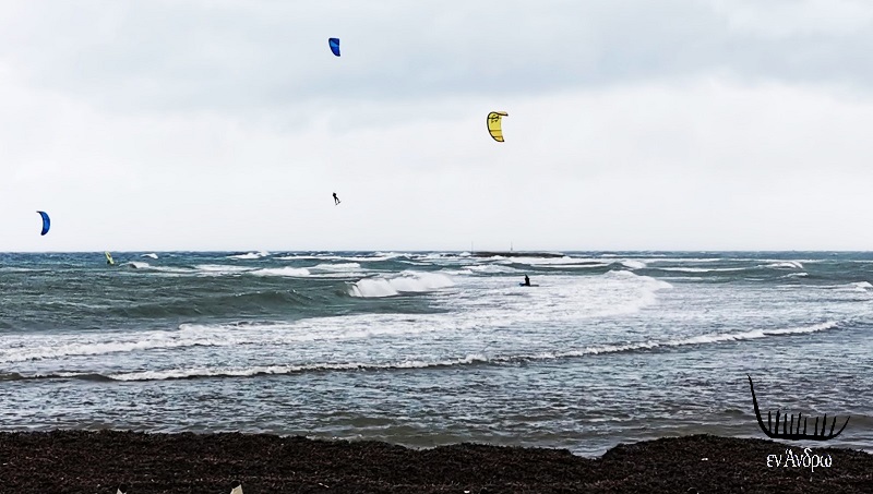 Κρύο ανεμοβρόχι με 8 μποφόρ στην παραλία. Πρώτη έκπληξη: μερικοί τύποι με πλαστικές φόρμες θαλάσσης κάνουν γυμναστικές ασκήσεις. Ξέρω ότι το μέρος είναι λέσχη των kite (αετών) και των serfing της Αττικής, αλλά δεν τους περίμενα μια τέτοια μέρα. Μπαίνουμε βιαστικοί στο καφέ-μπαρ και στην θαλπωρή. Δεύτερη έκπληξη: λίγοι οι θαμώνες, όμως η θέα πίσω από την τζαμαρία μοναδική. "Αετοί" και wind-serfing τρέχουν στα μανιασμένα κύματα: "υπάρχουν μερικοί πολύ ευτυχισμένοι άνθρωποι μέσα στην καταιγίδα" σκέφτομαι και ακουμπώ την κυριακάτικη εφημερίδα στο τραπέζι παραγγέλνοντας ριν προλάβουμε ένα ζεστό καπουτσίνο...