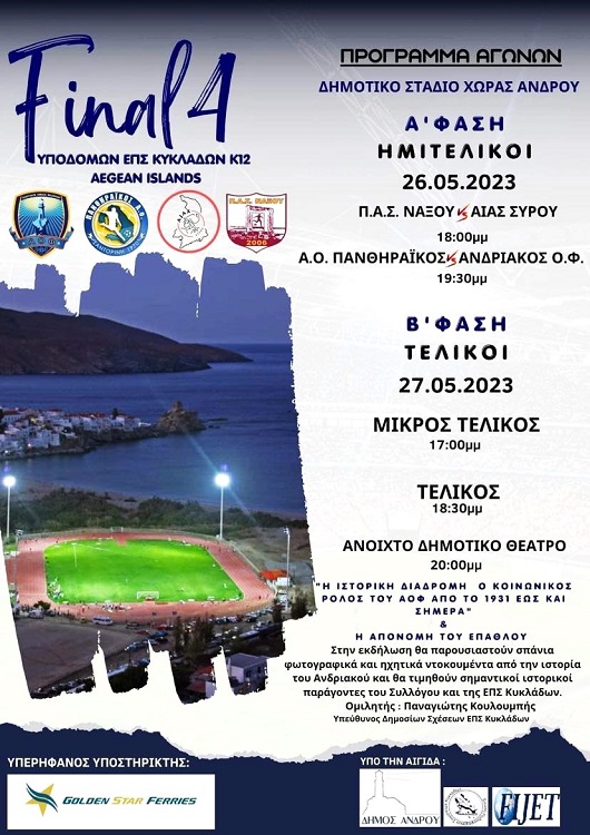 Ξεκινά στις 26 Μαΐου, ημέρα Παρασκευή και ώρα 18:00 στο Δημοτικό Στάδιο Άνδρου, ο πρώτος ποδοσφαιρικός αγώνας των τελικών Κυκλάδων για παιδιά μεταξύ Νάξου και Σύρου. Ακολουθεί στις 19:30 ο αγώνας μεταξύ Θήρας και Άνδρου. Οι ηττημένοι των δύο αγώνων θα παίξουν το Σάββατο 27 Μαΐου στις 17:00 στον μικρό τελικό της διοργάνωσης και οι νικητές στις 18:30 στο μεγάλο τελικό για την ανάδειξη του πρωταθλητή Κυκλάδων.