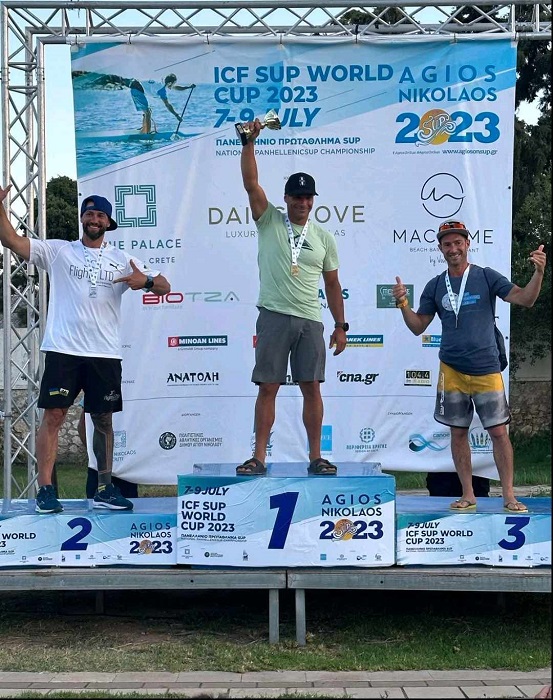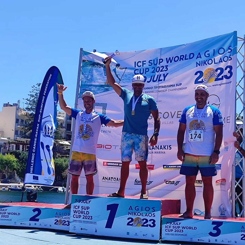 Σας στέλνω τις τελευταίες εξελίξεις στο SUP γιατί ξέρω ότι θέλετε να σας ενημερώνω. Την Κυριακή τελείωσε το παγκόσμιο κύπελλο sup όπου διοργανώθηκε για πρώτη φορά στην Ελλάδα στην διοργάνωση Άγιος on sup . Εγώ έλαβα μέρος στην κατηγορία master 40+ όπου και στο παγκόσμιο κύπελοκατέκτησα δύο χρυσά μετάλλια, ένα στο αγώνισμα του technical 1500m με πολλές στροφές, και ένα στο long distance 13κμ όπου με ξεκινήσαμε από Πλάκα Σπιναλόγκα και τερματίσαμε στην λίμνη Βουλισμένη στον Άγιο Νικόλαο.