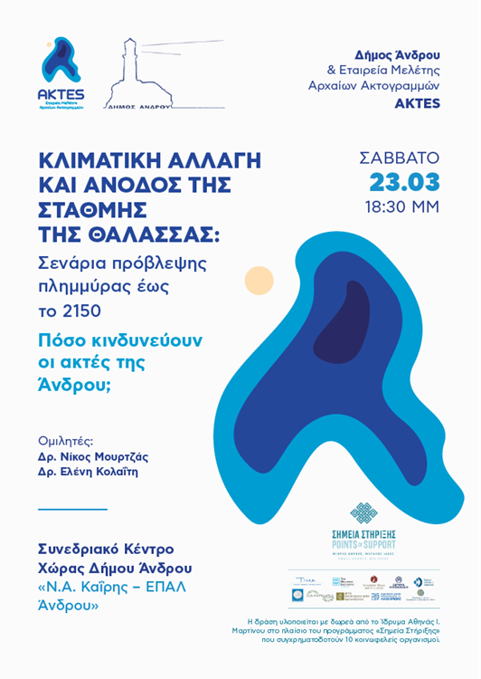 Η Εταιρεία Μελέτης Αρχαίων Ακτογραμμών - ΑΚΤΕS σε συνεργασία με τον Δήμο Άνδρου διοργανώνουν ομιλία με θέμα: «Κλιματική αλλαγή και άνοδος της στάθμης της θάλασσας: Σενάρια πρόβλεψης πλημμύρας έως το 2150. Πόσο κινδυνεύουν οι ακτές της Άνδρου;», το Σάββατο, 23 Μαρτίου 2024, στις 18:30 μ.μ., στο Συνεδριακό Κέντρο Χώρας Δήμου Άνδρου «Ν.Α. Καΐρης–ΕΠΑΛ Άνδρου».