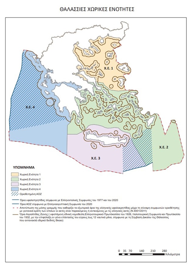Οι θαλάσσιες περιοχές που αποτυπώνονται στον χάρτη, συμπεριλαμβάνουν τις ελληνοϊταλικές συμφωνίες οριοθέτησης ΑΟΖ του 1977 και του 2020 και την ελληνοαιγυπτιακή συμφωνία του 2020, ενώ συμπίπτουν με τα όρια που απορρέουν από τον νόμο 4001/2011.