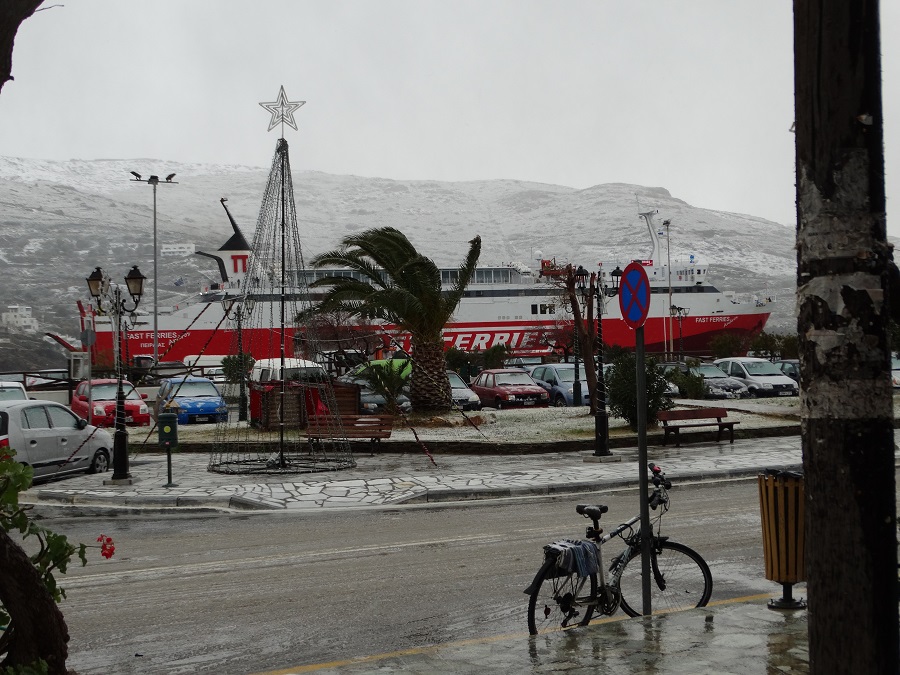 Μέσα στον χιονία να και το Andros που πάει να δέσει στο λευκό τοπίο. Ήθελα να ήξερα ποιος ήρθε με αυτόν τον καιρό με ποδήλατο; Και το άφησε ακουμπισμένο στο σήμα "απαγορεύεται το παρκάρισμα"!!! Ποιο παρκάρισμα; Τέτοια ώρα, τέτοια λόγια... (φωτ. Εν Άνδρω).