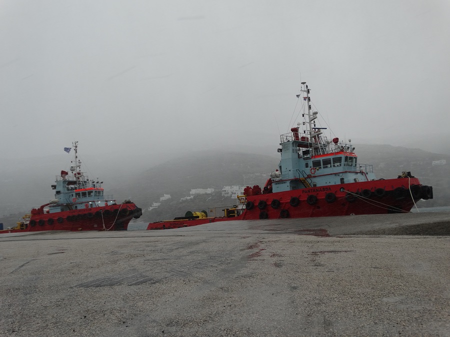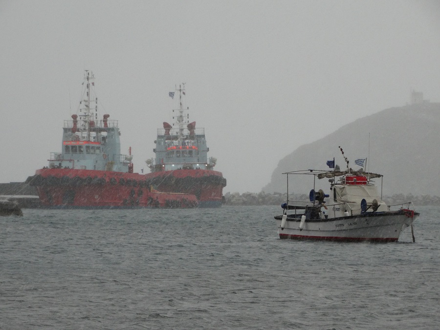Άλλη μια σκηνή με τα δύο ρυμουλκά: την Παντάνασα και τον Παντοκράτωρ. Σκάφη παντός καιρού, που δεν βγαίνουν - χωρίς λόγο - με τέτοιον καιρό στα ανοιχτά. Απέναντι χιονίζει συνεχώς στον Χάρακα. Κυριακή 8/1 απόμεσήμερο στο Γαύριο. Ή, και στο Λαύριο. Ή, κάπου βόρεια στον χάρτη. Το χιόνι ξεγελά και χάνεις τον προσανατολισμό (φωτ. Εν Άνδρω).