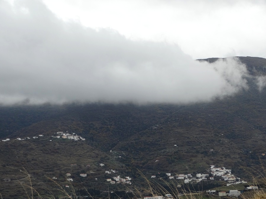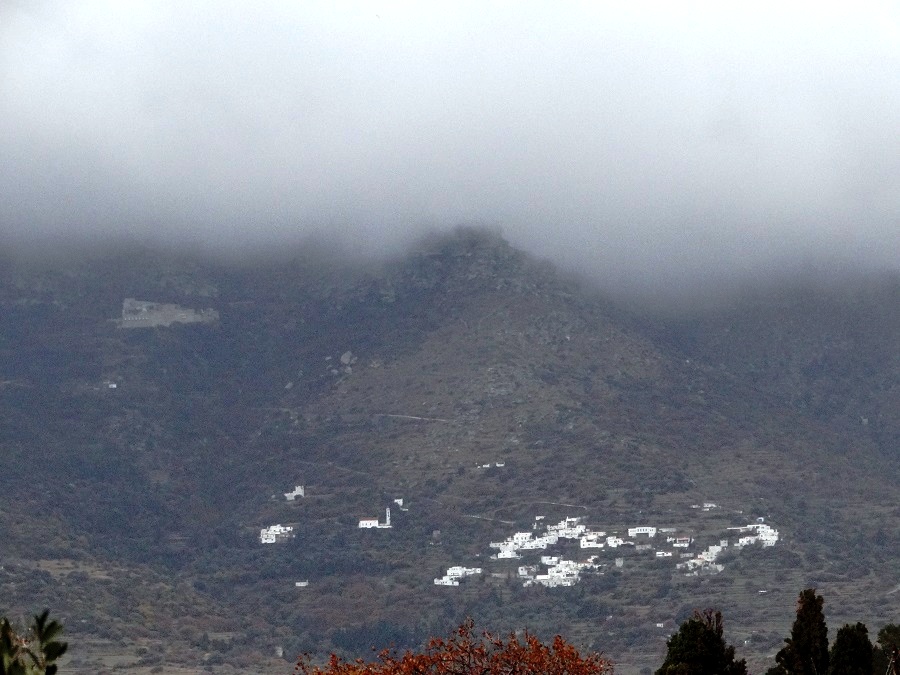 Οι Γερακώνες μέσα στην πρωινή καταιγίδα. Η Μονή Παναχράντου χαμένη πίσω από την κουρτίνα της βροχής και τα σύννεφα. Τα Φάλικα λίγο πιο κάτω ξεχωρίζουν λίγο περισσότερο (φωτ. Εν Άνδρω).