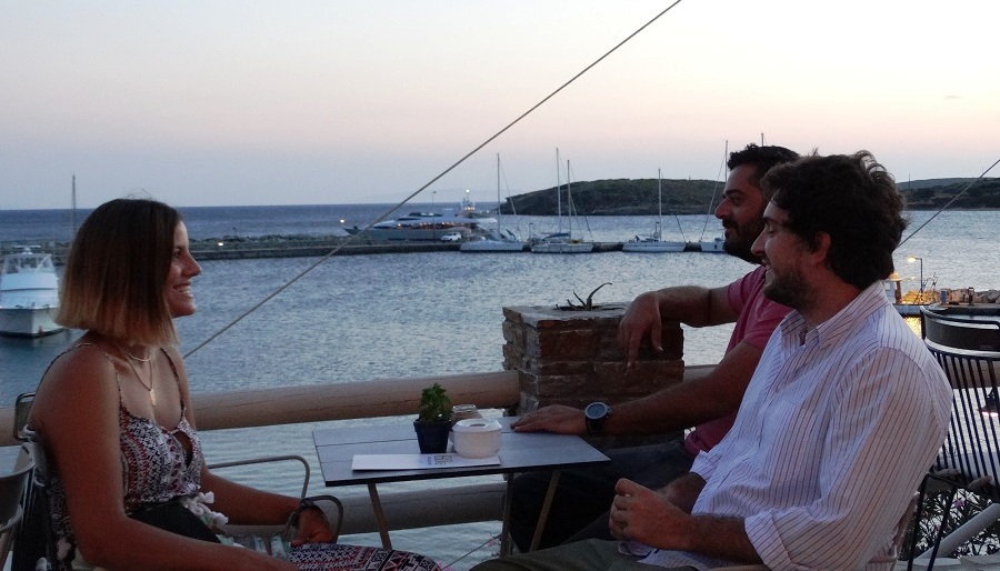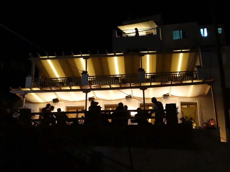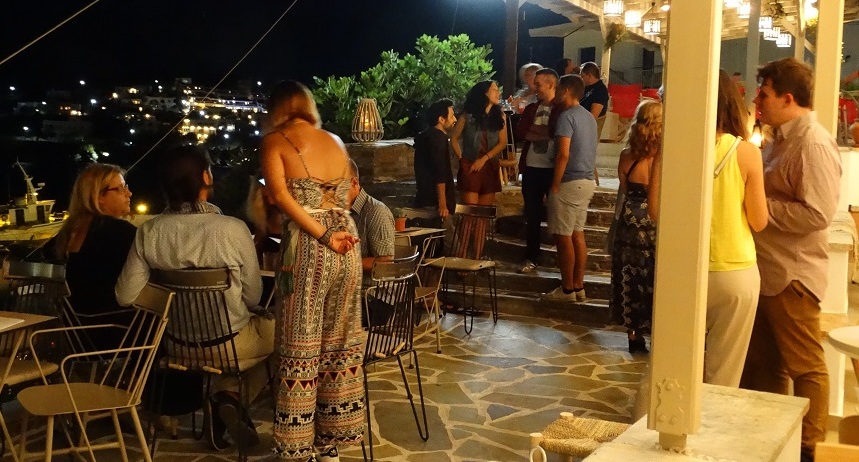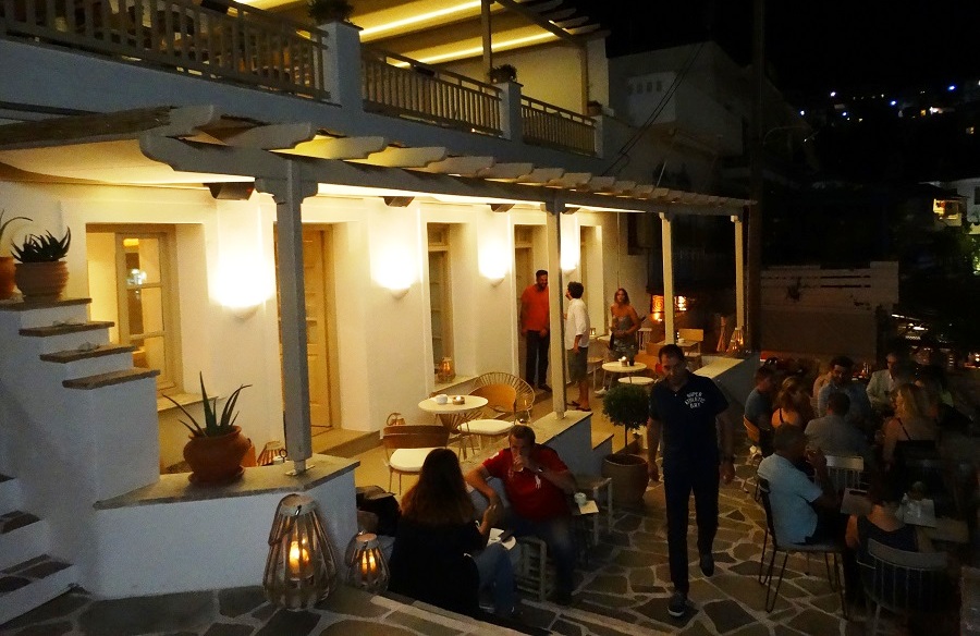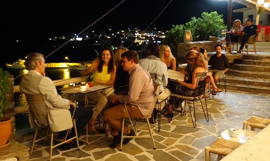 Η κάτω βεραντα στις 10:30 είχε γεμίσει. Ήταν ώρα να αποχωρούν οι απογευματινοί πελάτες που είχαν και δρόμο να κάνουν για επιστροφή (φωτ. Εν Άνδρω).