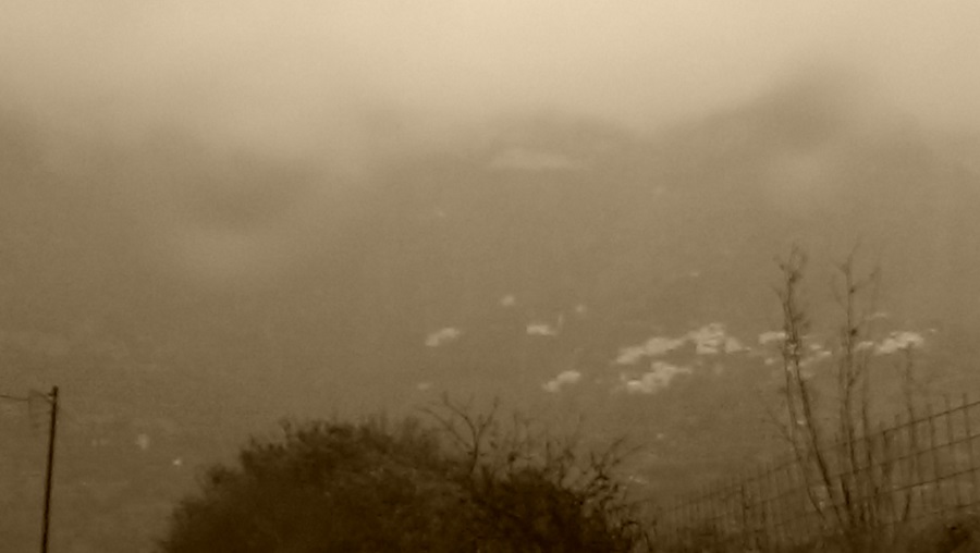 Φάλικα και Μονή Παναχράντου: τα Φάλικα κάπως φαίνονται, η Μονή χαμένη στα σύνεφα...