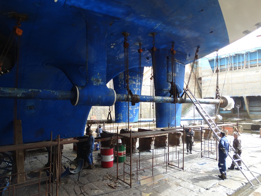 Οι δύο άξονες των μεγάλων προπελών υου πλοίου βγαλμένοι για να καθαριστούν και να ετοιμαστούν για τα ταξίδια που θα ακολουθήσουν (Φωτο: Εν Άνδρω).
