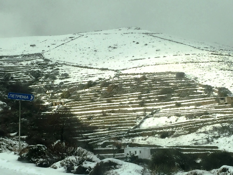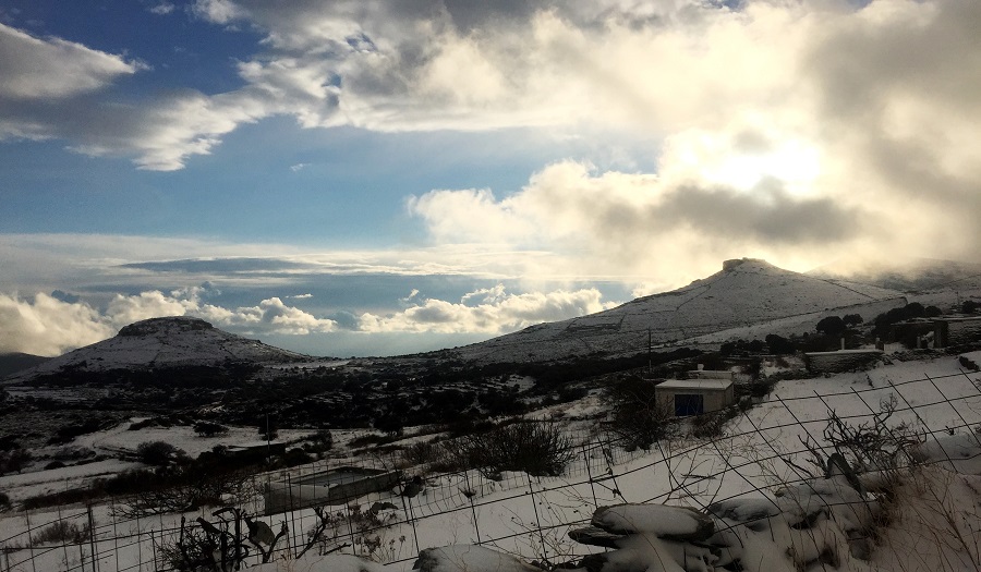 Οι κορυφές πίσω από τους Γερακώνες προς την μεριά του Κορθίου χιονισμένες (φωτ. π. Φιλάρετος).