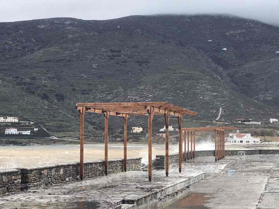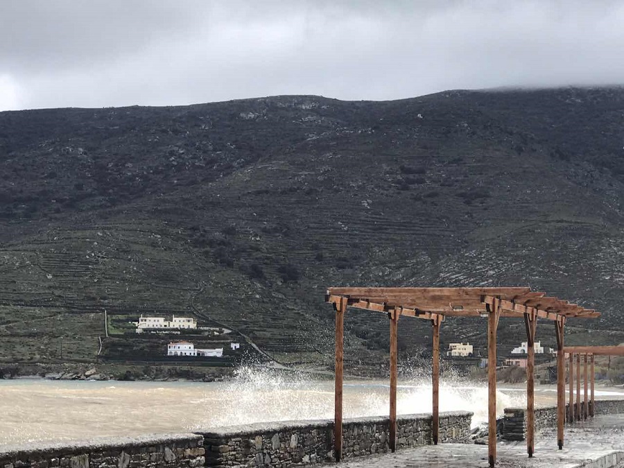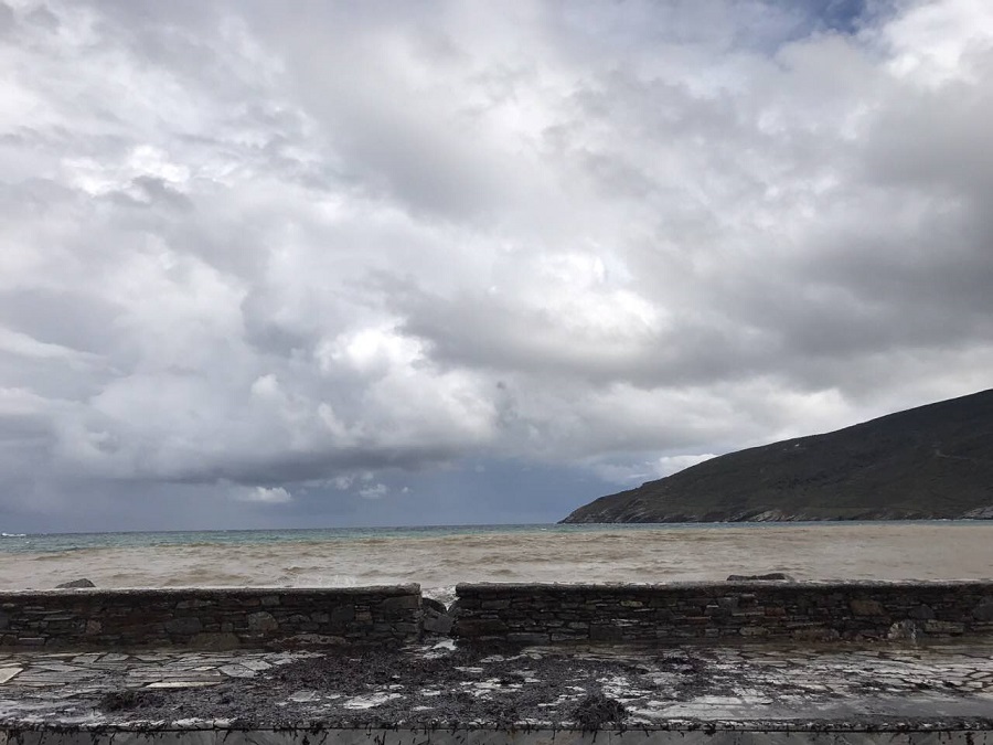 Και η καταιγίδα ξέσπασε σήμερα όλη μέρα στην Άνδρο. Στο Κόρθι το ποτάμι κατέβασε τόσο νερό και χώμα που έγινε καφέ η θάλασσα στον Όρμο. Τα κύματα μεγάλα και καφέ (!!!) έσπαγαν στην παραλία και στα βράχια δίνοντας ένα άλλο χρώμα τέτοιο που δύσκολα μπορεί να φανταστεί κανείς στο κυκλαδιτικό τόπίο. Εδώ η παραλία του Όρμου με τα κύματα να καβαλάνε την πέτρινη μάντρα και να βγαίνουν στον δρόμο... (φωτ. Χαρίδημος).