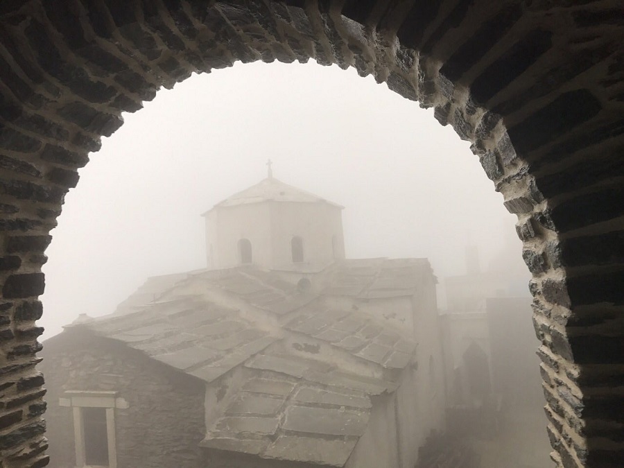 Το μοναστήρι της Παναχράντου την ώρα που πλησιάζει ένα σύννεφο μέσα στο οποίο θα χαθεί. Εικόνα σαν από βορειο-ευρωπαϊκό διήγημα. Ή, σκηνή σαν κάπου στα Χάϊλαντς της Σκωτίας. Κι όμως είναι Άνδρος και Γερακώνες!!! Ταξίδι στον χώρο και στον χρόνο σήμερα με την βοήθεια του καιρού... (φωτ. Χαρίδημος).