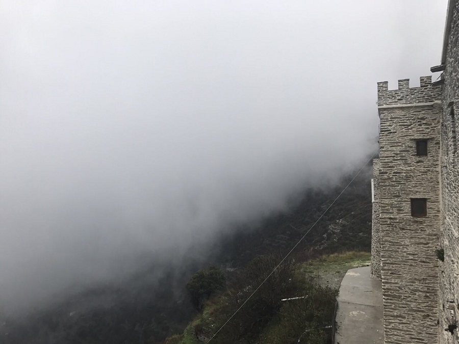 Μέσα στα σύννεφα και στην βροχή το καθολικό της Μονής λίγο εξώκοσμο. Τα παιχνίδια της ομίχλης και της καταιγίδας σήμερα το μεσημέρι... (φωτ. Χαρίδημος).