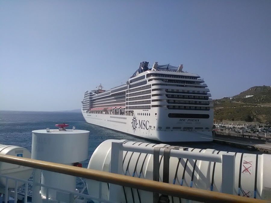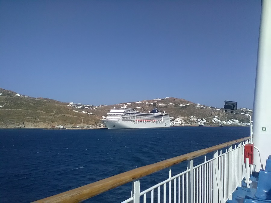 Δίπλα στο τεράστιο κρουαζιερόπλοιο το πλοίο της γραμμής μοιάζει σαν ένα καραβάκι! Δαβίδ και Γολιάθ! Κάπως έτσι και τα περισσότερα νησιά των Κυκλάδων μπροστά στη Μύκονο...