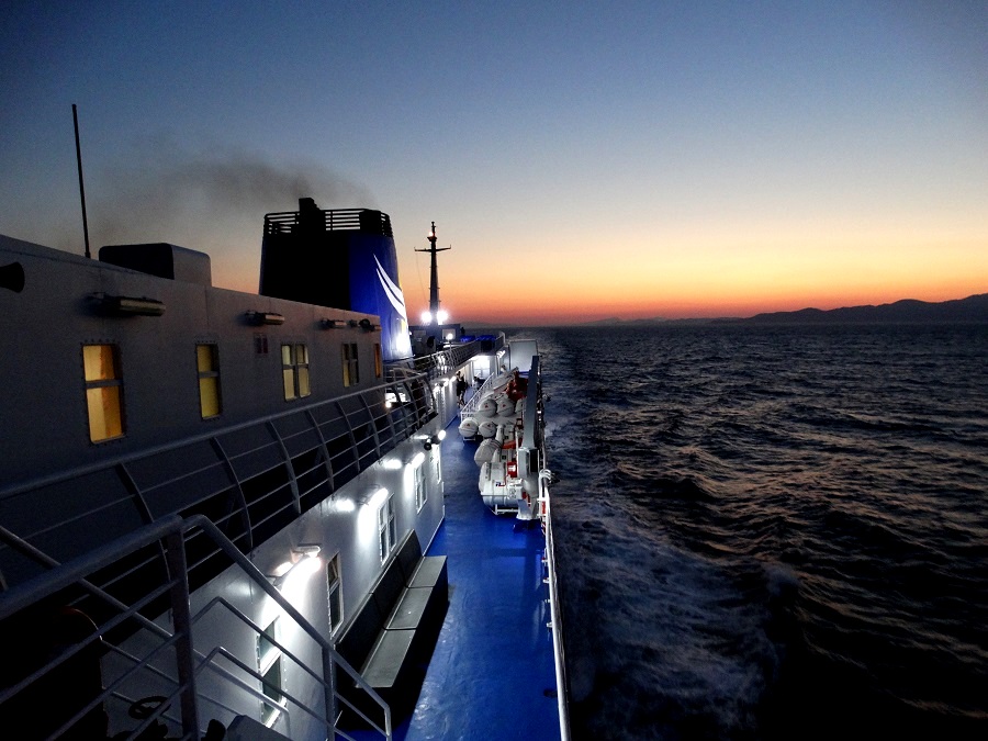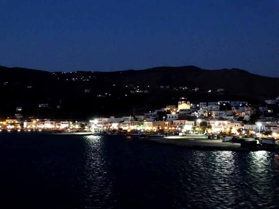 Το πλοίο ολόφωτο άφηνε πίσω του τη ν κοκκινοκίτρινη δύση και τράβαγε για το ασημένιο νυχτερινό φως της πανσελήνου. Άφηνε πίσω του την Αττική και την Εύβοια και τράβαγε για την Άνδρο... (φωτ. Εν Άνδρω).