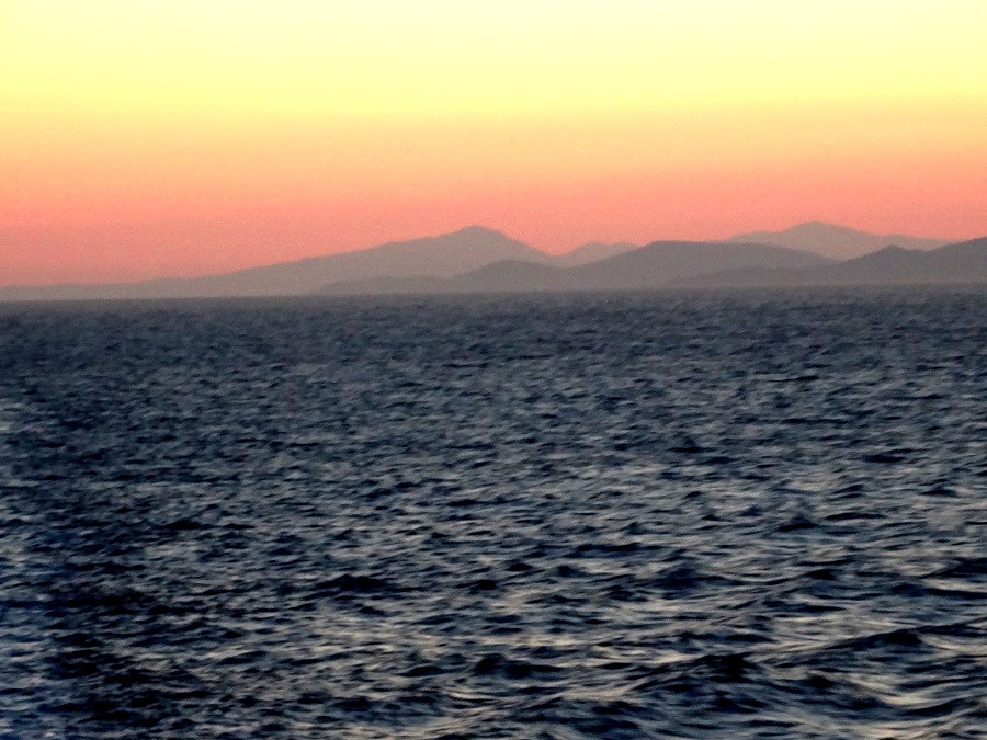 Πίσω μας ο ήλιος είχε μόλις δύσει στην Αττική ζωγραφίζοντας στον ουρανό όλα τα χρώματα από το κίτρινο μέχρι το κόκκινο. "Τα βουνά της Αττικής είναι πρόσωπα" έγραψε ο Σεφέρης. Παρακολουθήσαμε τα "πρόσωπα" της Αττικής και της Εύβοιας να λάμπουν πολύχρωμα πριν βυθιστούν στο σκοτάδι... (φωτ. Εν Άνδρω).