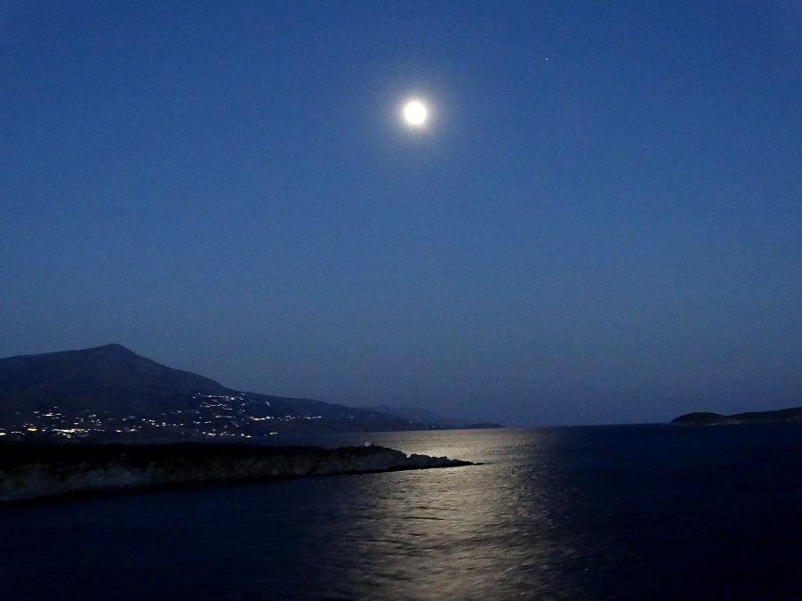 Ήταν η πανσέληνος των ερωτευμένων. Ήταν η πανσέληνος των γάμων. Ήταν η πανσέληνος του Ιουλίου. Ήταν ένα ακόμα νυχτερινό πέρασμα στον Κάβο Ντόρο με το πλοίο της γραμμής. Στη μέση του περάσματος το ολόγιομο φεγγάρι είχε ήδη φτάσει ψηλά πάνω από την θάλασσα φωτίζοντας την Άνδρο... (φωτ. Εν Άνδρω).