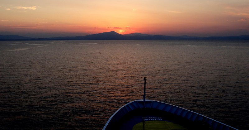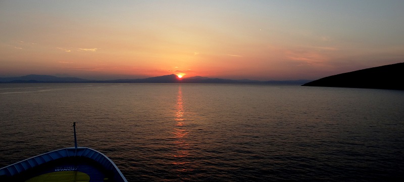 Στο δεύτερο πέρασμα: Ευβοϊκός. Στους Πεταλιούς. Βραδιάζει. Ο ήλιος χάνεται μέσα στα έντονα χρώματα της δυσης πίσω από τα βουνά της Αττικής γης. Το Superferry II έχοντας διασχίσει το Κρητικό πέλαγος και όλες τις Κυκλάδες πλησιάζει με εκατοντάδες επιβάτες και δεκάδες ΙΧ από Άνδρο στη Ραφήνα. Τελευταίο λιμάνι μιας μακράς μέρας με πολλά ανεβοκατεβάσματα χιλιάδων επιβατών στα ενδιάμεσα λιμάνια (φωτ. Εν Άνδρω)