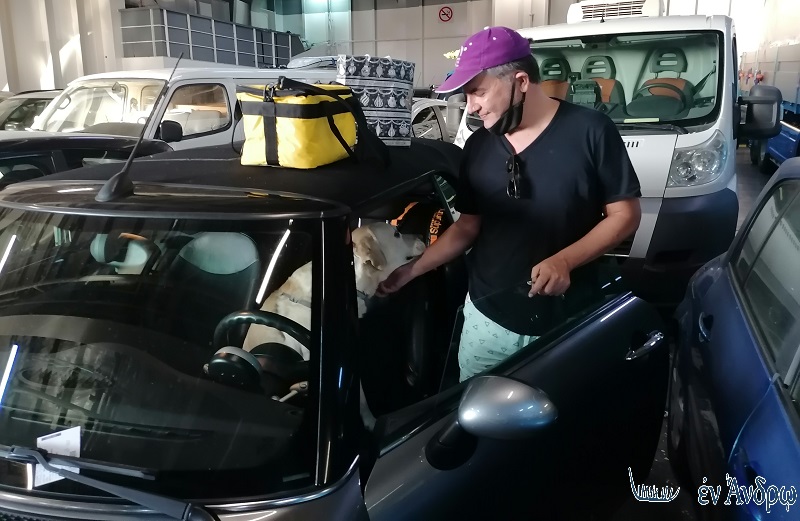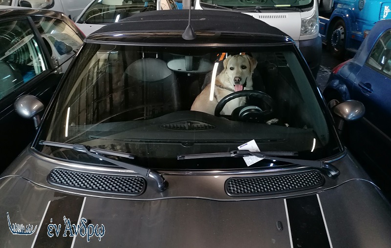Καθισμένος επί δυο ώρες στα πίσω πόδια, έμοιαζε με τον σοφέρ, σχεδόν ακίνητος να κοιτάζει συνεχώς τριγύρω. Ούτε ανησυχία, ούτε γαυγίσματα και μόνο το φιλικό κούνημα της ουράς σε όποιον πλησίαζε. Ακουμπούσε τα πόδια του στο τιμόνι… έτοιμος να βάλει μπρος. Πανέξυπνος!