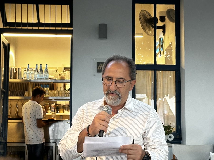 Ο πρόεδρος του Πανανδριακού Συλλόγου Ναυτικών Γιώργος Τηνιακός χαιρετίζει την παρουσίαση του βιβλίου Ναυτικές Ιστορίες της Άνδρου" στο καφέ-μπαρ Norte στην πλατεία Καΐρη.
