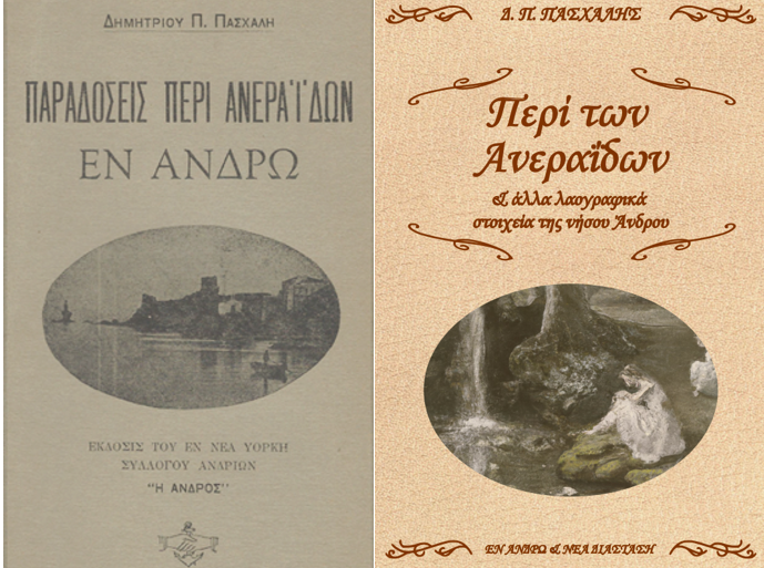 ΑΡΙΣΤΕΡΑ: "ΠΕΡΙ ΤΩΝ ΑΝΕΡΑΪΔΩΝ ΕΝ ΑΝΔΡΩ", του Δημητρίου Π. Πασχάλη, έκδοση του Συλλόγου Ανδρίων Νέας Υόρκης, 1935. ΔΕΞΙΑ: ΠΕΡΙ ΤΩΝ ΑΝΕΡΑΪΔΩΝ και άλλα λαογραφικά στοιχεία της νήσου Άνδρου", του Δ.Π. Πασχάλη, έκδοση Εν Άνδρω & Νέα Διάσταση, 2023, επιμέλεια Διαμαντής Μπασαντής.
