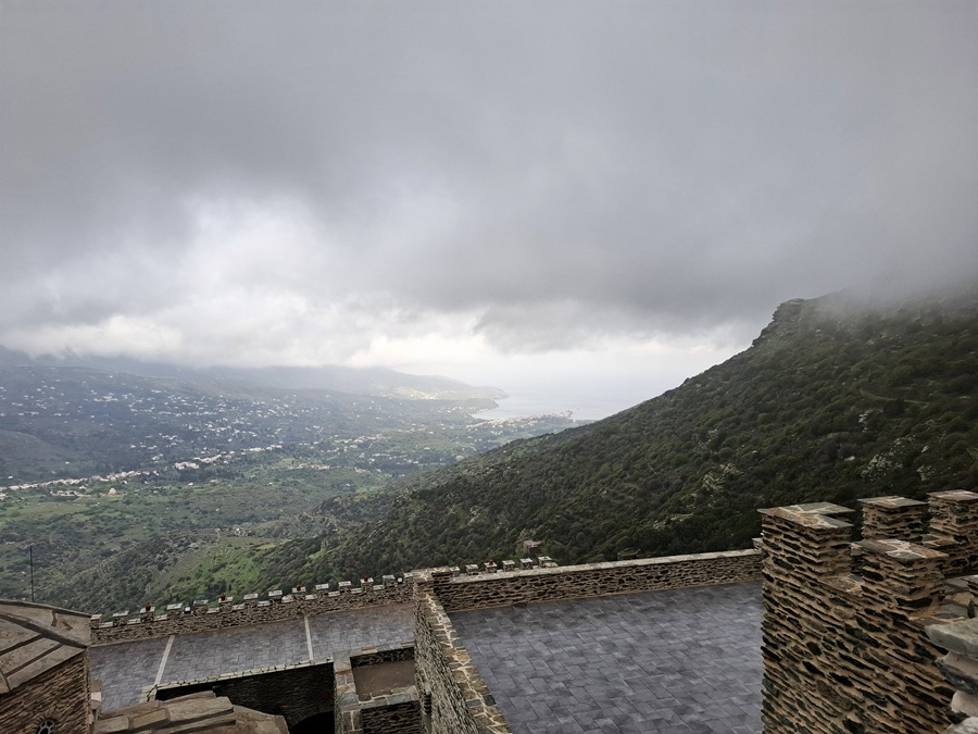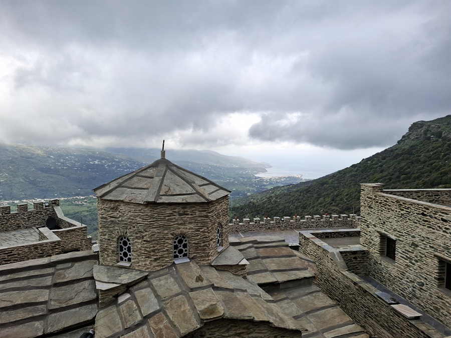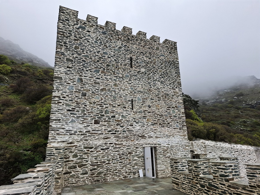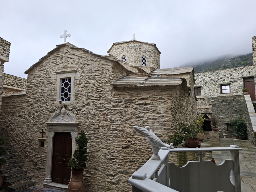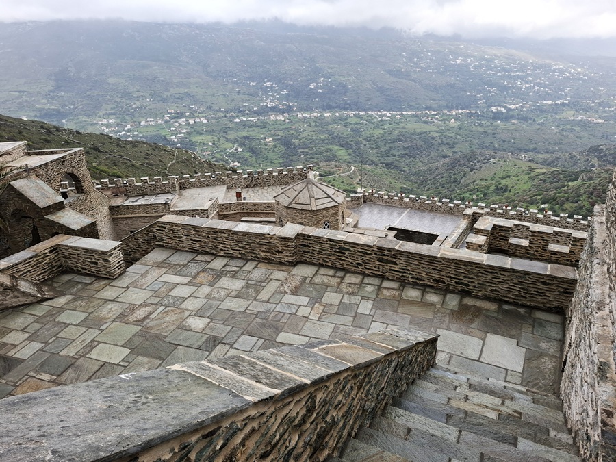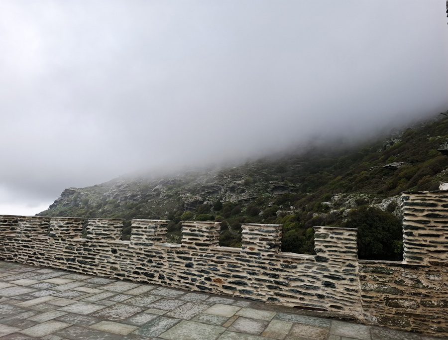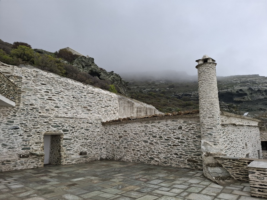 Απομεσήμερο. 2 Απριλίου 2025. Ανηφορίσαμε στην Πανάχραντο. Το πέτρινο μοναστήρι λίγο πιο κάτω από την κορυφή των Γερακώνων. Ένα σημάδι της ιστορίας στην Άνδρο. Αναφέρεται ως χρόνος κτίσης το 961 όταν ο αυτοκράτορας Νικηφόρος Φωκάς εκστράτευσε εναντίον των Σαρακηνών στην Κρήτη. Έταξε περνώντας από Άνδρο πως θα κτίσει μοναστήρι στην Πανάχραντο αν γυρίσει νικητής από την Κρήτη. Νίκησε, γύρισε και θεμελίωσε το μοναστήρι. Αυτά λέει ο απόηχος του περάσματος του αυτοκράτορα από την Άνδρο. Αλλά και αυτά επιβεβαιώνει και το κτίσιμο της μονής που οι θεμελιώσεις του είναι βυζαντινές και παραπέμπουν γύρω στον 11ο αιώνα, καθώς λένε οι ειδικοί. Απόηχος και ιστορία συναντώνται...