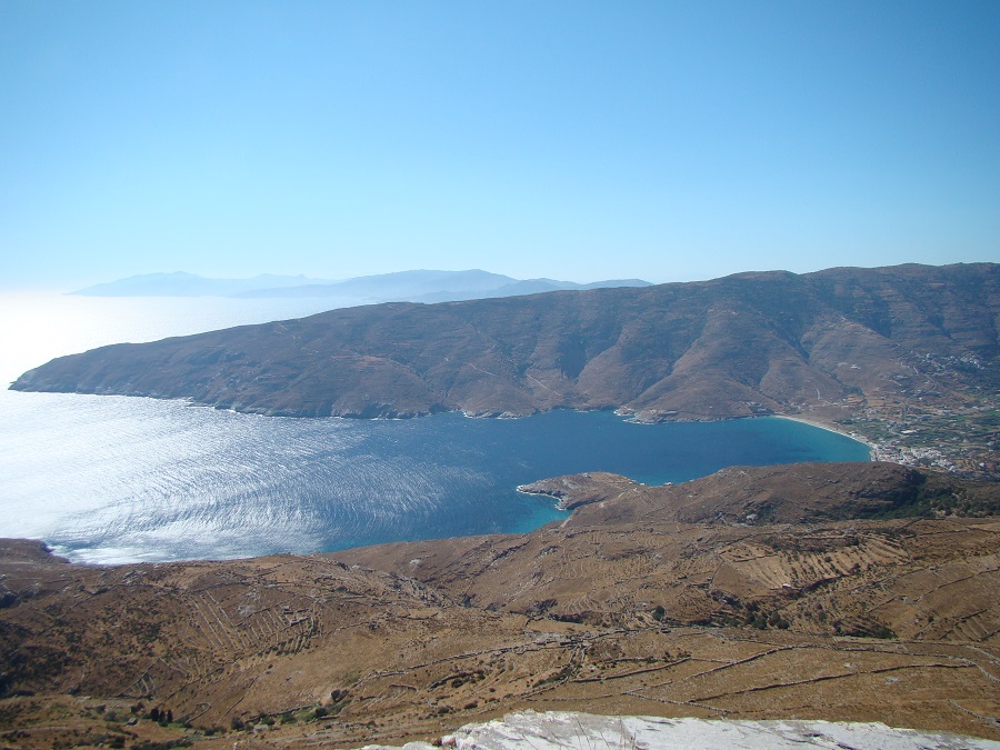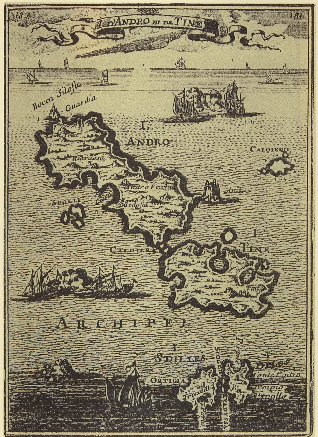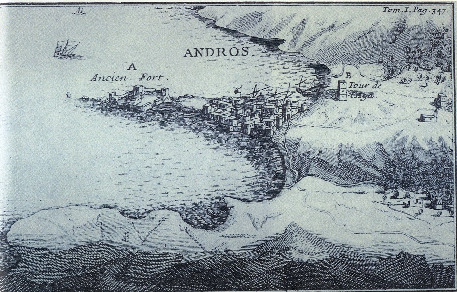 Η καταπράσινη ανατολική κοιλάδα της Άνδρου ανάμεσα στα βουνά Πέταλο και Γερακώνες καταλήγει σ’ έναν όρμο σαν ανοιχτό στόμα με την γλώσσα έξω. Η γλώσσα αυτή, τριγωνική χερσόνησος μ’ απότομες πλευρές, μ’ άγρια δέντρα και θάμνους σχεδόν ακουμπάει σε μια δύσβατη βραχονησίδα. Στον ισθμό ήταν δεμένη μια μεγάλη Βενετσιάνικη γαλέρα που σχεδόν ακουμπούσε στα βράχια κι’ από τις δυο της κουπαστές αφού τα κουπιά είχαν μέσα τραβηχτεί.