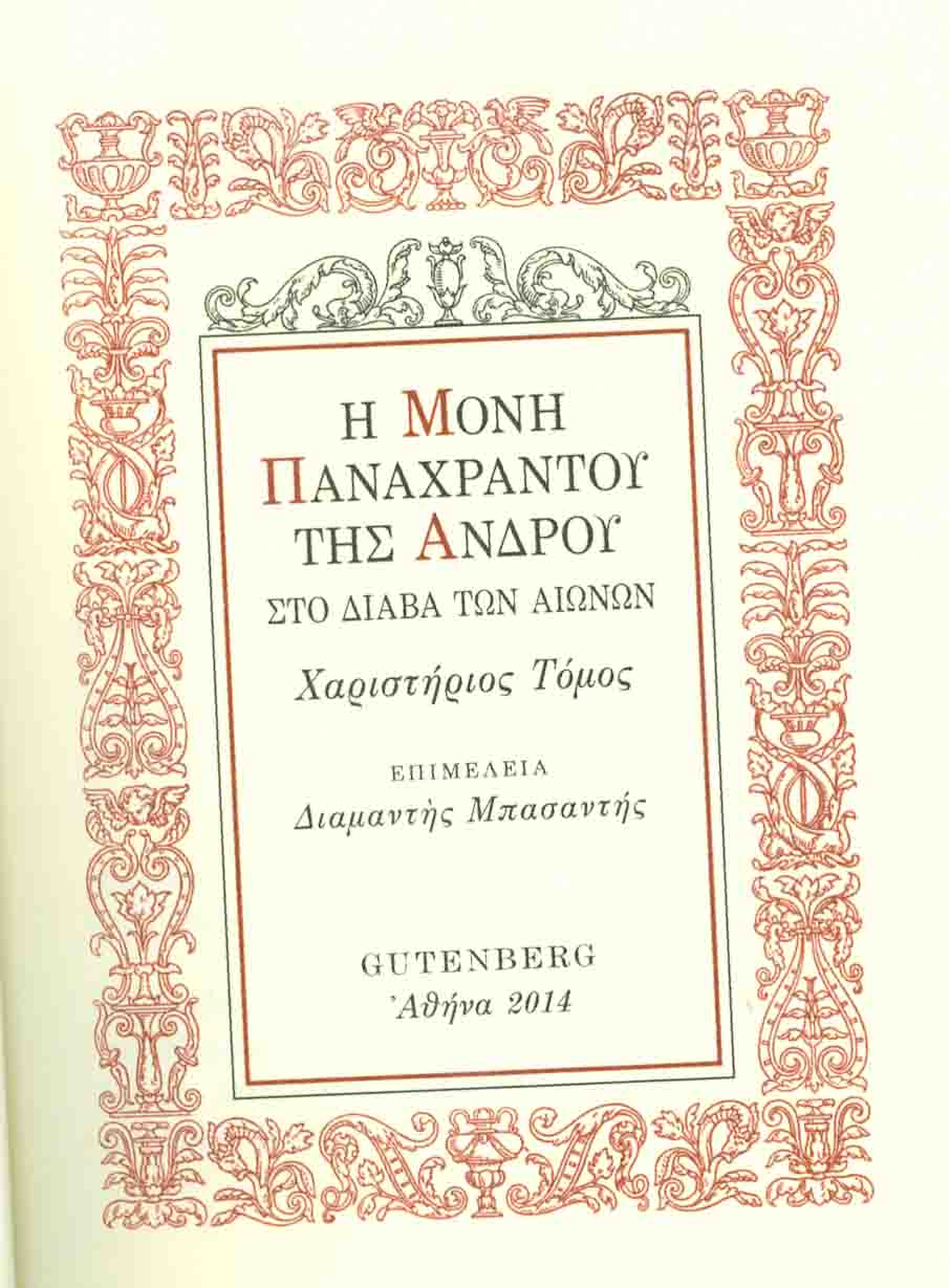 Το βιβλίο έρχεται ως συνέχεια της πρώτης ως σήμερα δημόσιας παρουσίας της Μονής στην Άνδρο, τον Ιούλιο του 2013, σε μεγάλη ανοικτή εσπερίδα που διοργανώθηκε στην Χώρα, την οποία παρακολούθησαν εκατοντάδες άνθρωποι. Περιέχει τα κείμενα που αναγνώστηκαν στην εσπερίδα, αλλά και κείμενα που προστέθηκαν στη συνέχεια για να συμπληρώσουν την ιστορική διερεύνηση του τόσο σημαντικού μοναστηριού της Άνδρου.