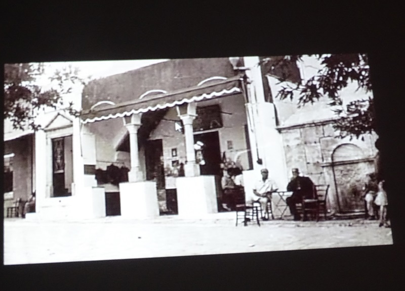Από την προβολή διαφανειών. Ζαχαροπλαστείο αρχές 20ου αιώνα στην πλατεία Καΐρη πριν γκρεμιστούν τα κτίρια και κτισθεί το αρχαιολογικό μουσείο (φωτ. Εν Άνδρω).