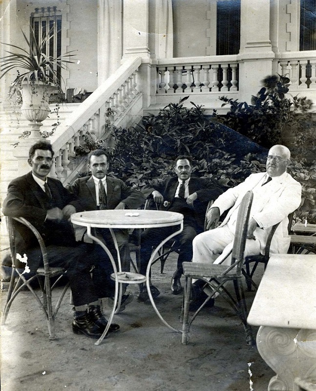 Ο Ιωάννης Αθηναίος (με λευκό κουστούμι) με φίλους του στην αυλή της βίλας του (φωτ. αρχείου Β. Παλαιοκρασσά).