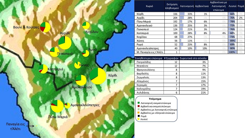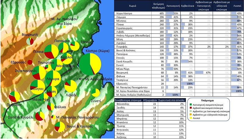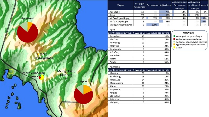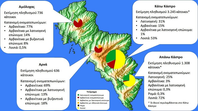 Επισημαίνεται ότι το εύρος των κύκλων παρουσιάζει το μέγεθος της σχετικής εκτίμησης πληθυσμού. Με πράσινο χρώμα παρουσιάζεται η κατανομή των λατινογενών ονοματεπωνύμων, με κόκκινο χρώμα των αρβανιτών, με πορτοκαλί χρώμα των αρβανιτών με βυζαντινά / ελληνικά επώνυμα, με ανοιχτό πράσινο χρώμα οι αρβανίτες με λατινογενή επώνυμα και με κίτρινο χρώμα οι λοιποί για τους οποίους δεν καταγράφεται ανωτέρω λατινογενές ή αρβανίτικο χαρακτηριστικό.
