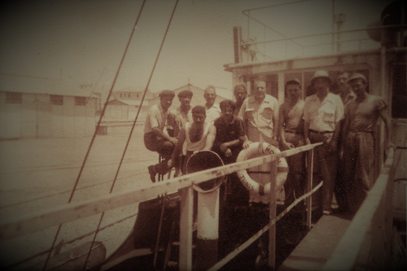 Ο πρώτος πλοικτήτης της Τριχωνίδος Αλέξανδρος Βερνίκος στη μέση με το πλήρωμα του πλοίου στη δεκαετία του 1950.