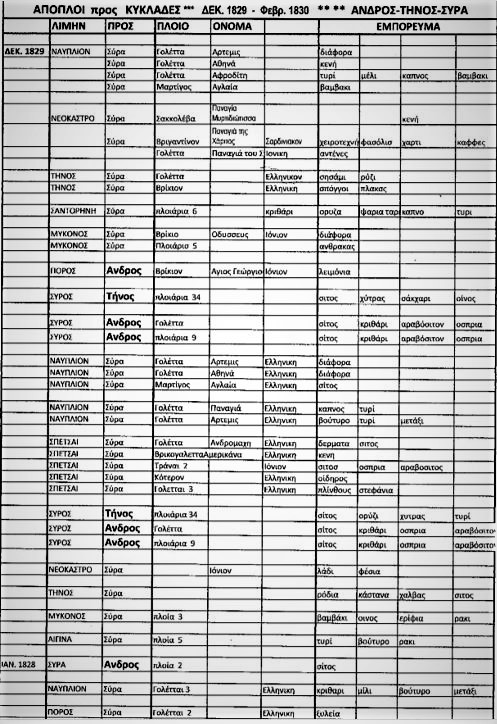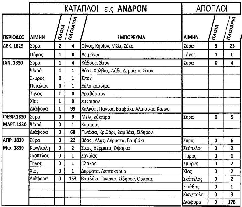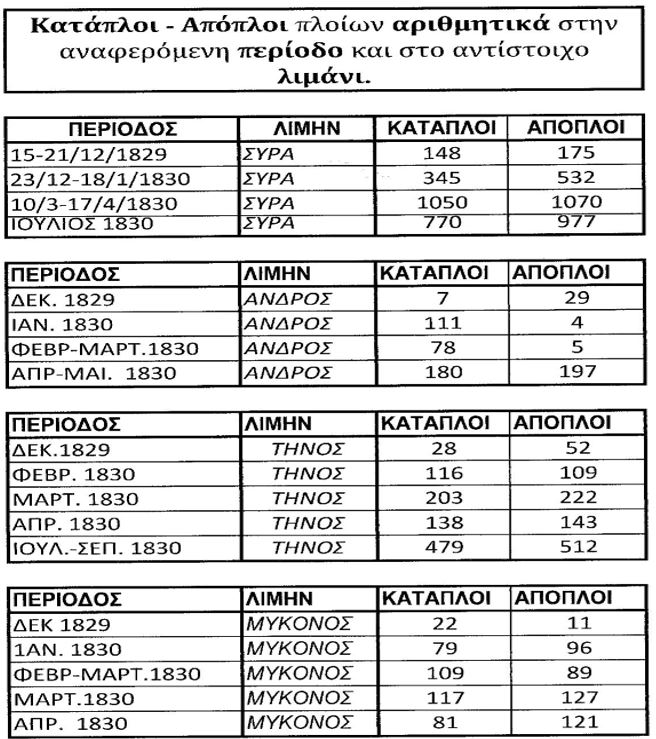 4. Βασικό εμπορικό κέντρο στο Αιγαίο και ειδικότερα στην περιοχή μας εκείνη την εποχή (πίνακες 1, 3 & 4) είναι η Σύρος. Ενδεικτικά στον πίνακα 2 καταγράφονται 2.313 απόπλοι και 2.754 κατάπλοι! Δεύτερη σε κίνηση η Τήνος με 964 κατάπλους και 1038 απόπλους. Την ίδια περίοδο η Μύκονος καταγράφει 408 κατάπλους και 441 απόπλους. Τελευταία σε εμπορική κίνηση - του συμπλέγματος των τεσσάρων γειτονικών νησιών - είναι η Άνδρος που στο διάστημα Δεκεμβρίου 1829 και Μαρτίου 1830 καταγράφει 376 κατάπλους και 235 απόπλους.