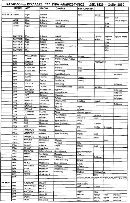 Τα εμπορικά στοιχεία των 1829-1830 αναφέρονται σε μια εποχή που το νέο ελληνικό κράτος ξεκίναγε υπό την διοίκηση του κυβερνήτη Ιωάννη Καποδίστρια. Αναφέρονταν σε μετακινήσεις πλοίων και εμπορευμάτων κυρίως στις Κυκλάδες. Από τους συγκεντρωτικούς και αναλυτικούς πίνακες της περιόδου προκύπτουν τα ακόλουθα συμπεράσματα: