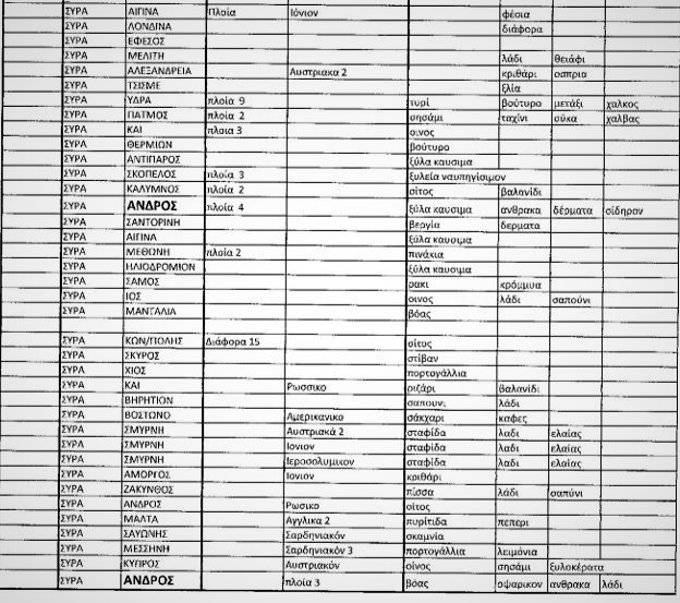 7. Κύριο λιμάνι τροφοδοσίας της Άνδρου ήταν η Σύρος (πίνακες 3 & 4). Όμως υπήρχε κινητικότητα και προς άλλα λιμάνι όπως Πόρος, Χίος, Ψαρά, Τήνος Σκόπελος, Σκιάθος, Κωνσταντινούπολη, Σμύρνη κλπ.