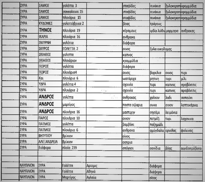 2. Τα αναλυτικά στοιχεία των εμπορικών μετακινήσεων (πίνακες 3 & 4) δείχνουν πως τα νησιά αγοράζουν, πωλούν και μεταφέρουν μεταξύ τους εμπορεύματα, αλλά μεταφέρουν και εμπορεύματα από την κυρίως Ελλάδα (Ναύπλιο-Αίγινα πρώτες πόλεις πρωτεύουσες του νέου ελληνικού κράτους). Μεταφέρονται εμπορεύματα όπως πρώτες ύλες για τροφή (σιτάρι, κριθάρι, ρύζι, μέλι, σύκα, αλάτι, τυρί, ψάρια παστά, ζάχαρ, οίνος, κλπ), για ένδυση (βαμβάκι, δέρματα κλπ), κατασκευές (σίδερος, πλίνθοι, ξυλεία κλπ), καύσιμα (κάρβουνο, ξύλα κλπ)...