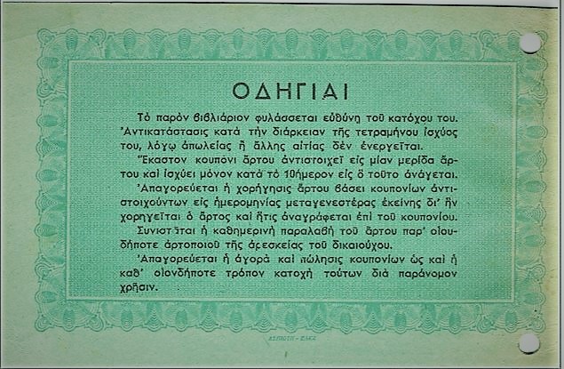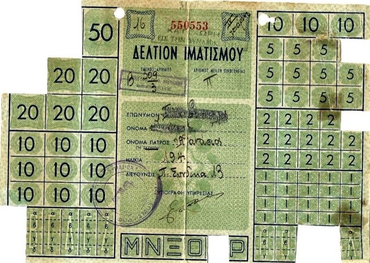 Τότε λοιπόν είχε καθιερωθεί το ΑΤΟΜΙΚΟ ΕΠΙΣΙΤΙΣΤΙΚΟ ΔΕΛΤΙΟ και το ΔΕΛΤΙΟ ΙΜΑΤΙΣΜΟΥ. Κανένας δεν μπορούσε να αγοράσει τρόφιμα,  ψωμί και είδη ιματισμού, πλέον των Δελτίων. Οι ποσότητες των τροφίμων με δελτία ήταν ελαχιστότατες.  Μου είχαν πει ότι όσοι είχαν οπωροφόρα δέντρα στις αυλές τους ήταν τυχεροί, διότι το να τρως  πχ βερίκοκα με ψωμί και λίγο τυρί ήταν μεγάλη ιστορία.