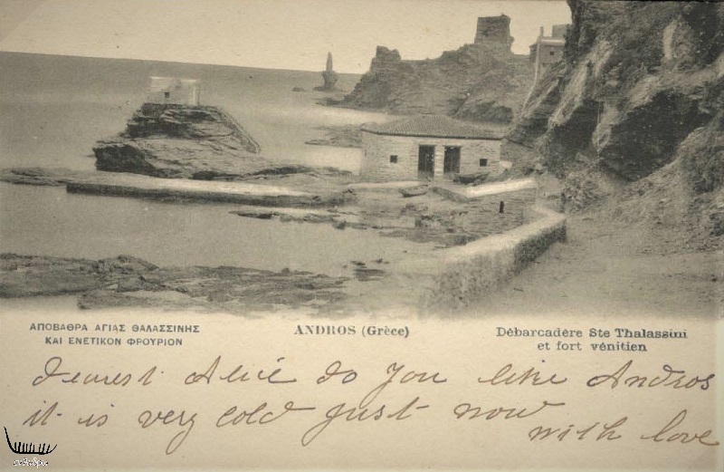 Ιστορίες μικρές που όλες μαζί και κάθε μια χώρια απεικονίζουν μια άλλη εντελώς διαφορετική και ξεχασμένη Άνδρο. Η φάρος της Φάσσας το 1900, Αγία Θαλασσινή του 1901 και της δεκαετίας του 1930, η Χώρα στις αρχές του 20ου αιώνα, το Γαύριο του 1935 και του 1943 και το Μπατσί του 1953. Η κάρτα της Φάσσας στέλνεται στο Ιωάννη Χασούλη που σπούδαζε στο διάσημο Ροβέρτειο Σχολή της Κωνσταντινούπολης και δείχνει τις στενές σχέσεις της Άνδρου με την Πολη πριν το 1914. Οι κάρτες της Χώρας είναι πιθανώς από εορτές, του Γαυρίου (1935) και Μπατσίου (1953) είναι από καλοκαιρινές διακοπές εκείνων των εποχών - ΔΙΑΜΑΝΤΗΣ ΜΠΑΣΑΝΤΗΣ
