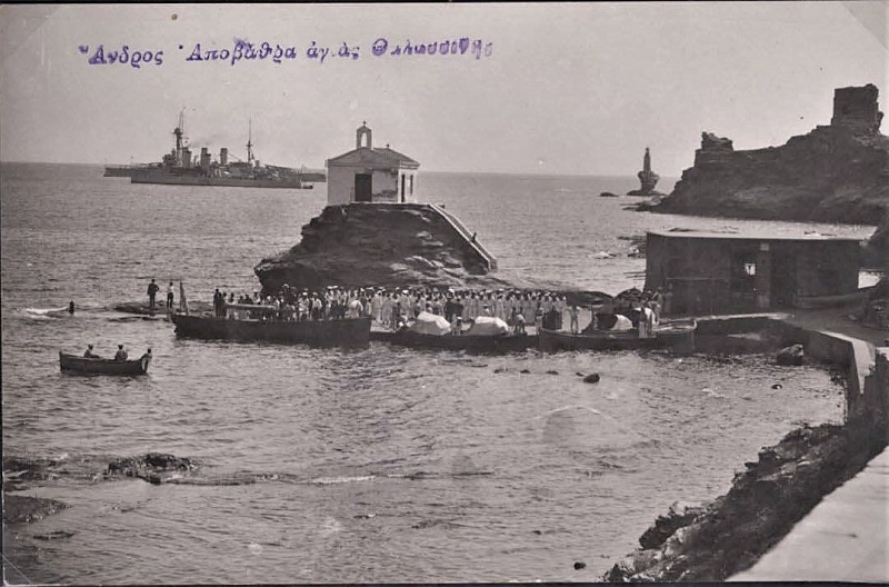 ΑΝΔΡΟΣ - ΑΠΟΒΑΘΡΑ ΑΓΙΑΣ ΘΑΛΑΣΣΙΝΗΣ: Έκδοση Αλέξανδρου Α. Πατεράκη. Πλοία του ελληνικού στόλου αποβιβάζουν το πλήρωμα στην αποβάθρα. Δεκαετία 1930.