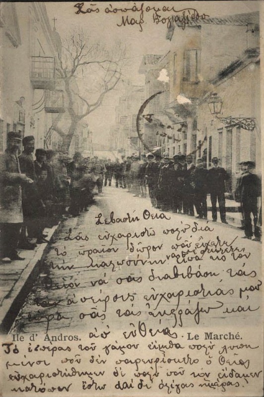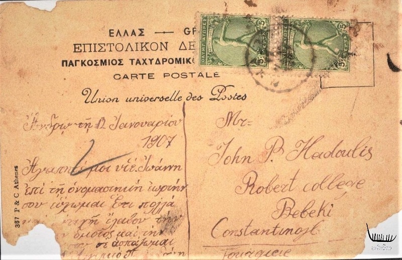 Η ΠΑΡΑΠΑΝΩ ΚΑΡΤΑ ΤΑΧΥΔΡΟΜΗΘΗΚΕ ΤΟ 1907. ΣΤΗΝ ΠΙΣΩ ΟΨΗ ΤΗΣ ΓΡΑΦΕΙ: "Εν Άνδρω τη 12η Ιανουαρίου 1907, Αγαπητέ μοι υιέ Ιωάννη, επί τη ονομαστική εωρτήν σου εύχομαι έτι πολλά..." Η κάρτα εστάλη στον John R. Haidoulis/ Robert College/ Conastinouple/ Τουρκία...