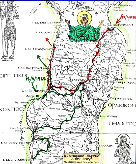 Έκανα την διαδρομή (με ΠΡΑΣΙΝΟ χρώμα)  Δάφνη – Καρυαί -Μονή Κουτλουμουσίου – Ιερά Μονή Σίμωνος Πέτρας – Ιερά Μονή Οσίου Γρηγορίου – Ιερά Μονή Αγίου Διονυσίου – με καΐκι  στη Δάφνη - Ιερά Μονή  Παντελεήμωνος – με καΐκι στην Ουρανούπολη.