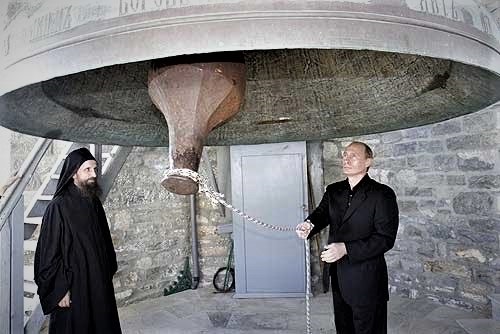Πήγαμε στο καμπαναριό. Η μεγάλη καμπάνα ζύγιζε 12.650 οκάδες (15 τόνους), έγινε εν Ρωσία το 1850. Έχει 65 «κοιμισμένους» - με λίγες εξαιρέσεις – Καλογήρους. Πολύ ενδιαφέρον είχε ο Μοναχός Αμβράκιος μορφωμένος και εξυπηρετικός.  Χειριζόταν  πολλές μικρές καμπάνες  με χέρια, πόδια, πλήκτρα . Είχε 3  δεύτερες. Η μεγάλη ήταν γεμάτη από γράμματα.  Το Ρολόι (1894) χτυπούσε ανά τέταρτο με πολλαπλούς ήχους .