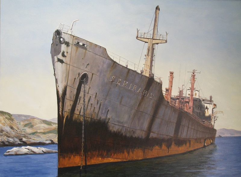 Η δεύτερη είναι μια ζωγραφική αποτύπωση του ναυαγίου όπως ήταν το 1996 από τον ανδριώτη ζωγράφο Μιχάλη Τζανουλίνο. Τον πίνακα είχαμε φωτογραφίσει στην αναδρομική έκθεση που είχε κάνει το 2007 στο Εμπειρίκιο Γυμνάσιο. Τότε τον ανακαλύψαμε και τον παρουσιάσαμε στο κοινό της Άνδρου από την εφημερίδα ΑΠΟΓΕΥΜΑΤΙΝΗ (εκεί δούλευα εκείνα τα χρόνια ως αρθρογράφος),,,