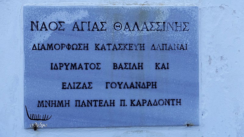 Άλλη μια γενική άποψη της Αγίας Θαλασσινής. Εικόνα ειδυλλιακή και χαρακτηριστική του μοναδικού κυκλαδικού τοπίου. Σύμφωνα με τα στοιχεία η σημερινή διαμόρφωση της Αγίας Θαλασσινής έγινε το 1985. Τότε κατεδαφίστηκε το πέτρινο κτίριο των σφαγείων της Χώρας και δημιουργήθηκε μικρή πλατεία με προβλήτα, η οποία ανέδειξε κυριολεκτικά το μικρό εξωκλήσι και του χάρισε μοναδική γοητεία. Η μεταμόρφωση της Αγίας Θαλασσινής και του περιβόλου της αποτέλεσε ένα μικρό πολιτισμικό «θαύμα» έργο του Ιδρύματος Βασίλη & Ελίζας Γουλανδρή που άλλαξε ολόκληρη τη βόρεια πλευρά της Χώρας (βιβλίος Η ΑΝΔΡΟΣ ΜΕΣΑ ΣΤΟΝ ΧΡΟΝΟ - Σ.Μ.Καμπάνης & Δ.Μπασαντής 2015).