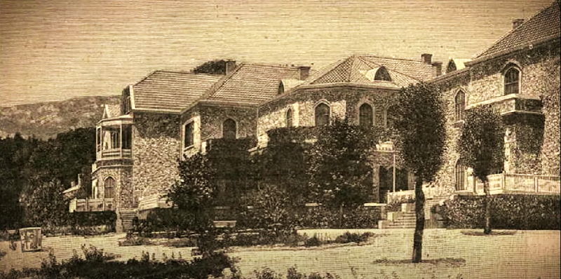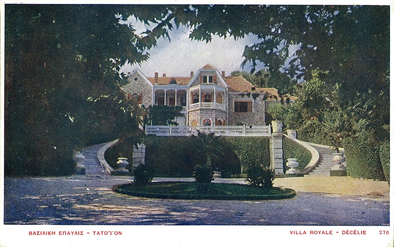 Βασιλική Έπαυλις - Τατόϊ. Καρτ ποστάλ που εκδόθηκε από την εταιρεία Ασπιώτη το 1915 περίπου. Το "παλάτι" όπως ήταν πριν την μεγάλη πυρκαγιά του 1916 που κατέστρεψε το κτήμα για πρώτη φορά.
