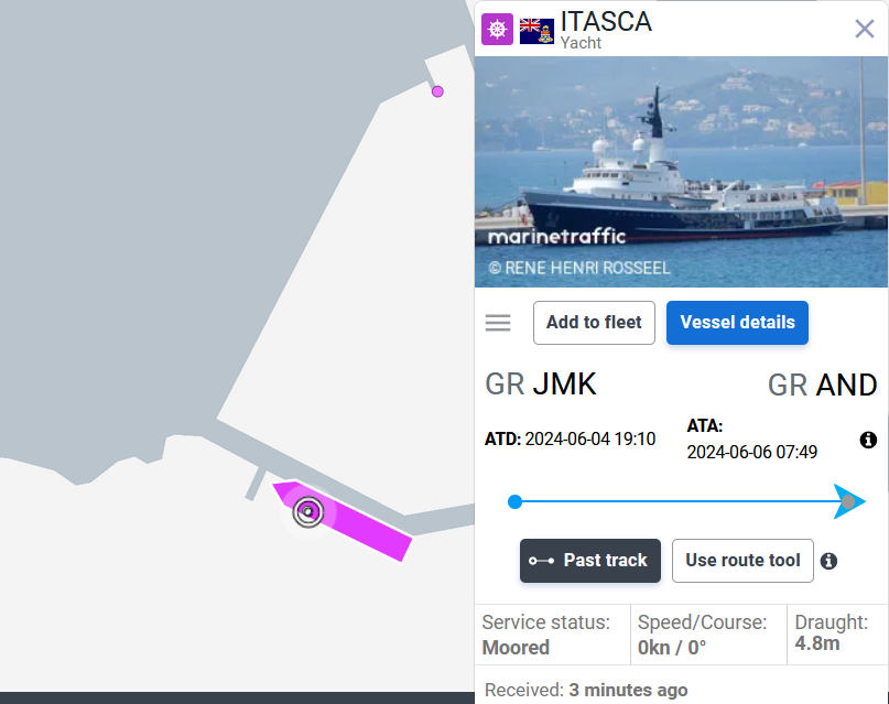 Ένα σούπερ-γιωτ στο λιμάνι της Χώρας το Σαββατοκύριακο των ευρωπαϊκών εκλογών. Σύμφωνα με το Marine Traffic είναι το ITASCA. To σκάφος είναι υπό σημαία Κέιμαν, είναι μήκος 53,98 μέτρα και πλάτος 10,47 μέτρα. Είναι σκάφος αναψυχής με 10 καμπίνες. Το ψάξαμε γιατί ατυχώς η Άνδρος δεν είναι συνηθισμένη να υποδέχεται σούοερ-γιωτ.