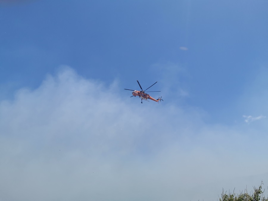 Στην παραπάνω φωτογραφία βλέπουμε την πρώτη ρίψη από το ελικόπτερο. Ακολούθησαν πολλές ακόμα μιας και το μέτωπο φούντωσε. Τουλάχιστον για μισή ώρα τα ελικόπτερα έσβηναν το μέτωπο.  (τα αεροπλάνα λόγω των ισχυρών ανέμων ήρθαν κι έφυγαν). Να σημειώσουμε με αγώνα των εθελοντών και των ιδιοκτητών της ταβέρνας Μποζάκη σώθηκε η εγκατάσταση. Επίσης να σημειώσουμε τον αγώνα κατοικων και εθελοντών να εκκενώσουν τα κατοικημένα σπίτια από αρρώστους, παιδιά και ηλικιωμένους.